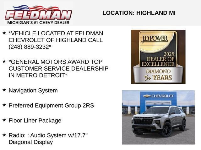 *LOCATED AT FELDMAN CHEVROLET OF HIGHLAND CALL (248) 859-7646* *GENERAL MOTORS AWARDED TOP CUSTOMER SERVICE DEALERSHIP IN METRO DETROIT* $1250 - GM Costco Executive Member Private Offer . Exp. 04/30/2026 $500 - GM Rewards Card Sales Sign Up and Spend Offer. Exp. 06/30/2026 $6,524 off MSRP!*VEHICLE LOCATED AT FELDMAN CHEVROLET OF HIGHLAND CALL (248) 889-3232*, *GENERAL MOTORS AWARD TOP CUSTOMER SERVICE DEALERSHIP IN METRO DETROIT*, AWD.Sterling Gray Metallic 2026 Chevrolet Traverse RS AWD 8-Speed Automatic 2.5L DOHC*Descriptions of vehicles are often VIN generated and may not accurately represent the current condition or equipment for this specific vehicle * * Out of state consumers: See dealer for details regarding state registration fees and taxing * * See dealer for details regarding product add ons preinstalled on vehicle * Recent Arrival!** Vehicle may include GM Employee pricing plus tax, title, license, destination, doc fee, and CVR-not all vehicles qualify. Pricing includes all eligible rebate. Must finance with GM Financial. Available only while supplies last! Dealer installed accessories and upgrades not shown in advertised prices. See dealer for details. Feldman Chevrolet of Highland 248 889 3232.